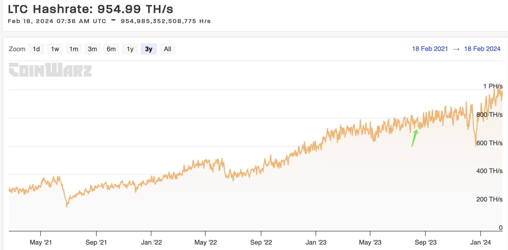 但 LTC 网络的算力倒是几乎没有受到减半的影响, 8 月至今增长了超过 30% :