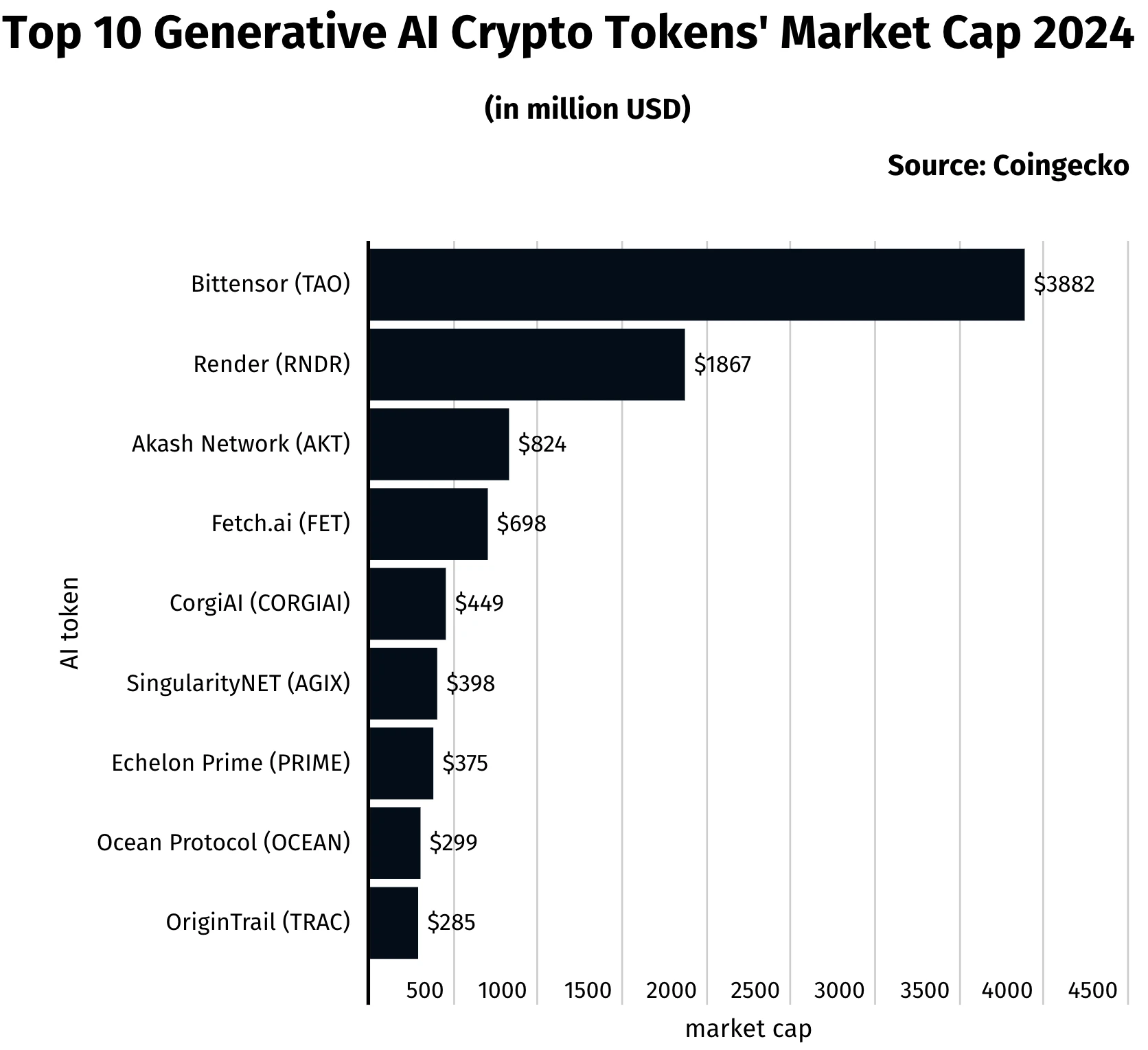 市值最高的 AI 相关加密货币是 TAO(Bittensor),达到了 38.8 亿美元,五个月来价格已经上涨 11 倍。 Bittensor (TAO) 是一种去中心化机器学习协议,充当人工智能和机器学习领域算法提供商和用户的市场。矿工通过向网络贡献其处理能力和机器学习模型来提供算法。需要 ML 算法作为自己解决方案输入的客户需要支付协议的本机加密代币 TAO 才能访问它们。