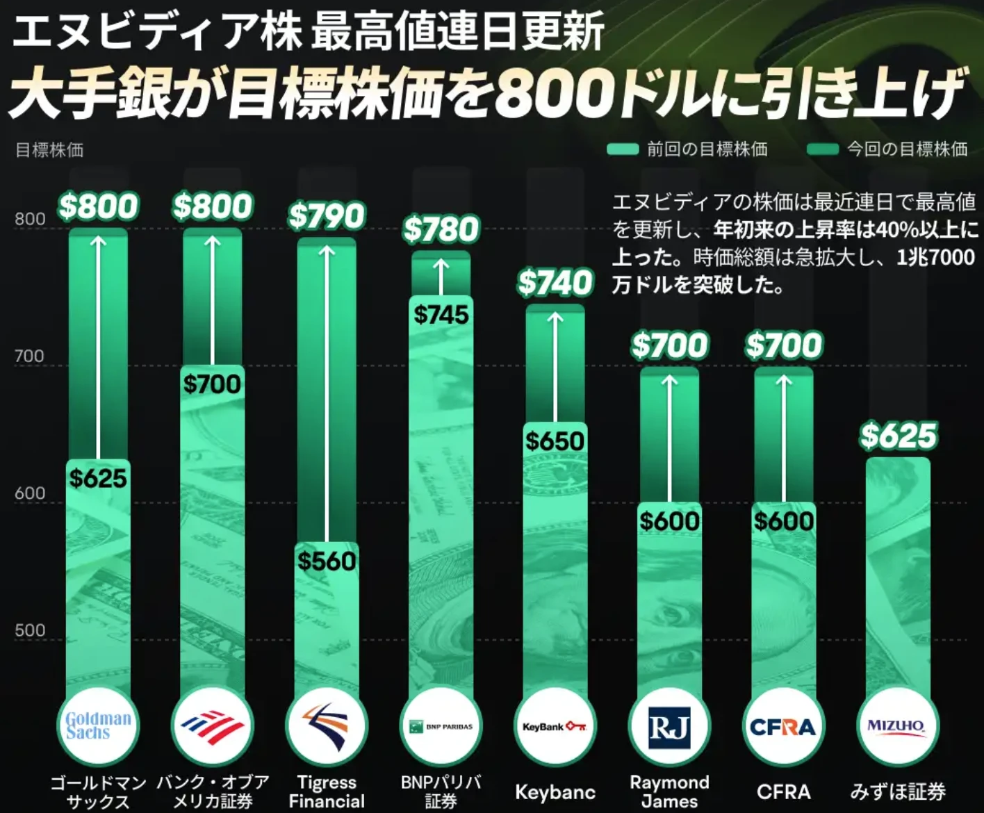 高盛、美银等机构最近纷纷上调 Nvidia 价格目标,若按 800 美元的新目标,意味着估值将超过 2 万亿美元: