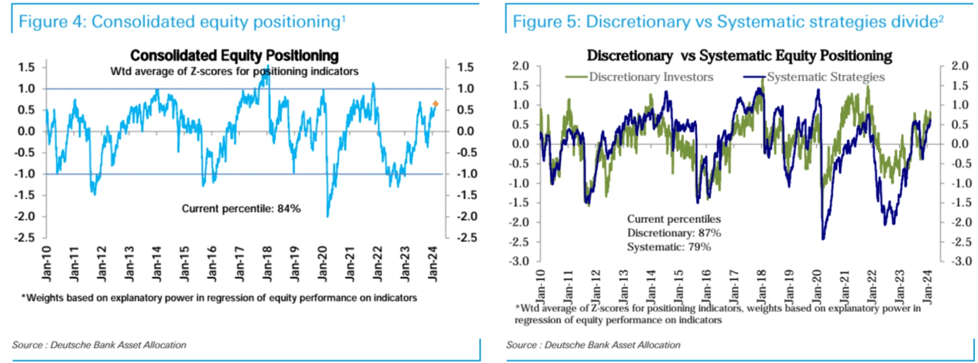 德意志银行口径的股票总体仓位的衡量有所下降,从六个月高点轻微回落,当前位于第 84 百分位。其中自主投资者的仓位有所下降(88 – 87 百分位),系统性策略的仓位持续小幅上升(78 – 79 百分位)