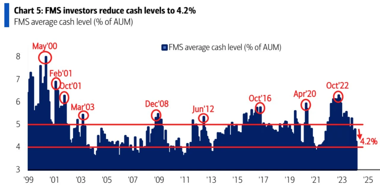 美银 2 月调查的基金经理投资组合里现金水平下降至 4.2% ,现金达到或低于 4.0% 时会触发没美银的“卖出”信号: