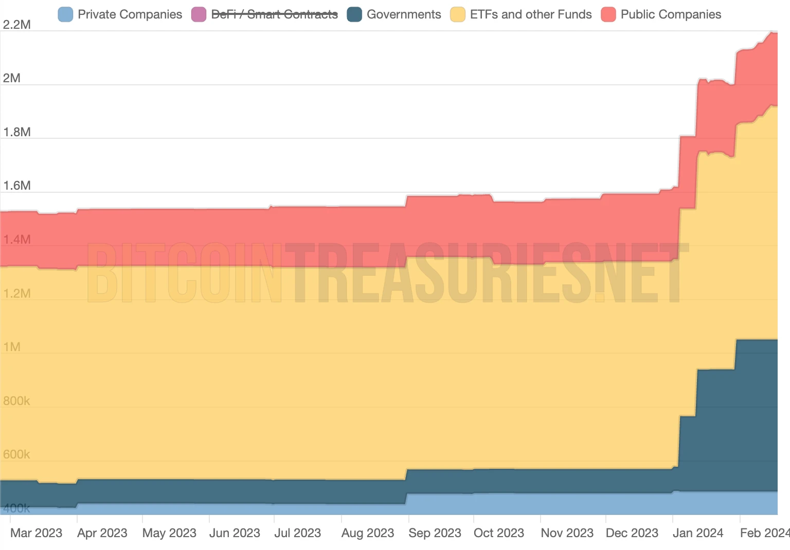 因为另一边,当前被企业、政府、基金持有的 BTC 总数接近 220 万个价值超过 1100 亿美元,超过了 BTC 计划发行总量的 10% ,超过已挖出 BTC 的 11% ,如果算上未披露的数据这个比例应该更高,但对比美股整体机构持仓比例高达 70 ~ 80% ,还有很大的上升空间: