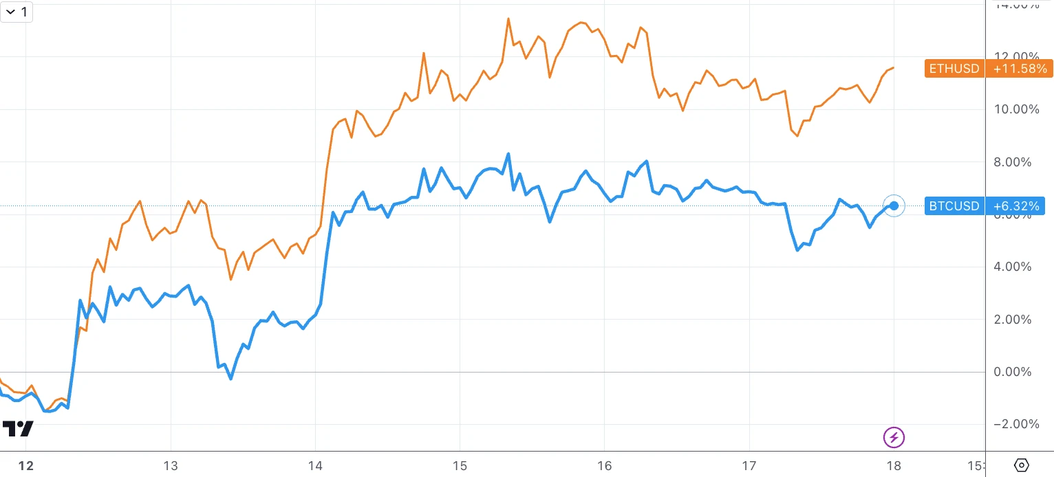 从去年 6 月贝莱德提出 BTC 现货 ETF 申请以来,BTC 反弹幅度炒股 100% ,而同期 ETH 只有 70% ,理论上市值更小且使用场景更多的 ETH 的价格应该更具弹性,所以 ETH 的现货 ETF 如果能够发行,其牛市价格表现应该好于 BTC。另外,受监管的以太产品还可以在代币质押时提供高达 5% 的 APY,这点比无收益的 BTC ETF 产品相比将具有吸引力。
