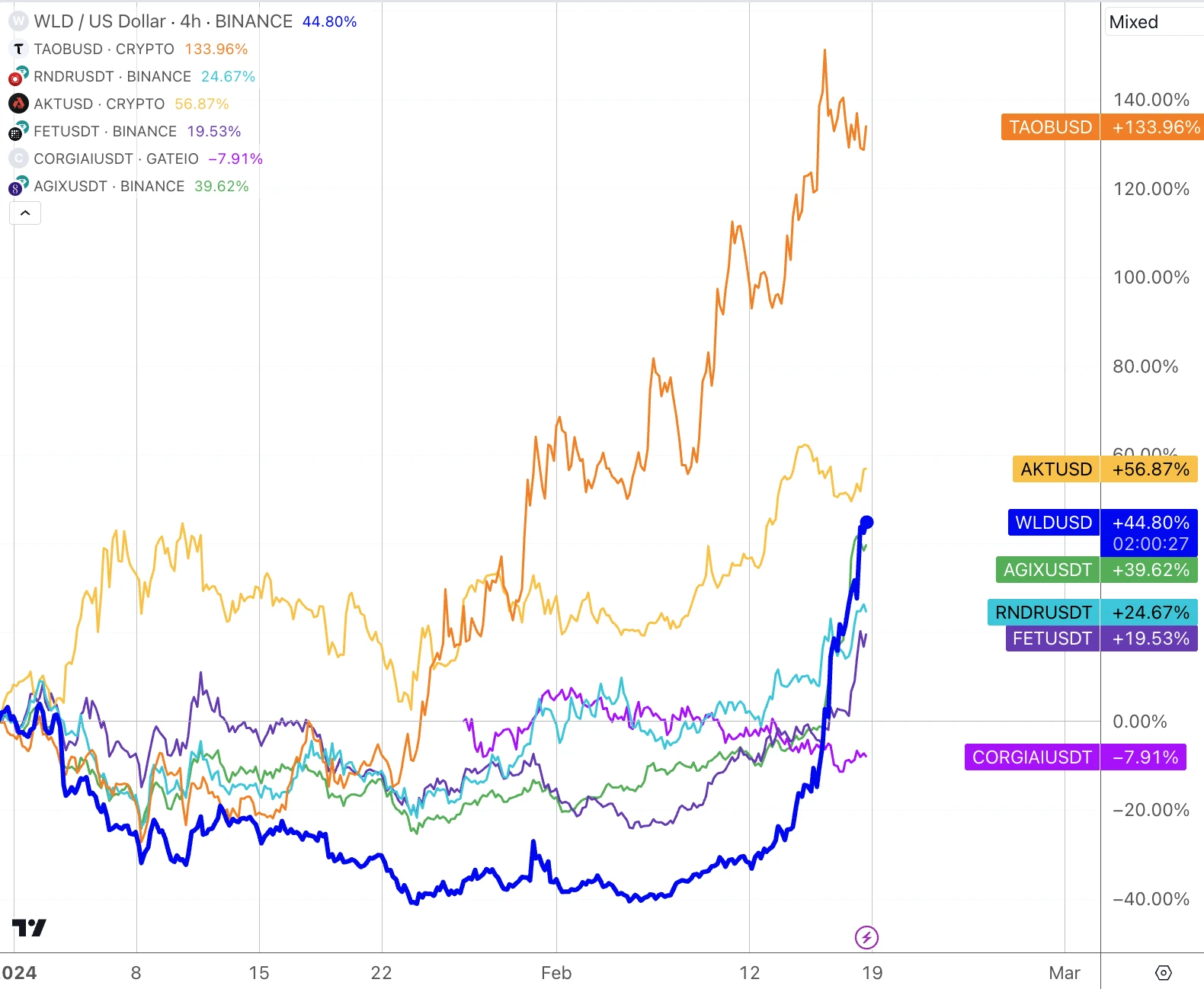 然而我们认为,还有 AI 概念数字货币应该还包括 WorldCoin($WLD),尽管该项目本身是数字身份概念,但由于是 AI 行业领头羊 OpenAI 创始人发布的项目,所以每次 OpenAI 或 Sam 本人有大新闻时,WLD 都无一例外会跟随波动。例如上周 OpenAI 推出名为 Sora 的文本到视频 AI 模型效果惊艳全球,随后 WLD 暴涨超过 50% 。Sam 认为未来一个拥有大量人工智能的世界中,了解谁是人类变得越来越重要,这是 WLD 的重要使命之一。