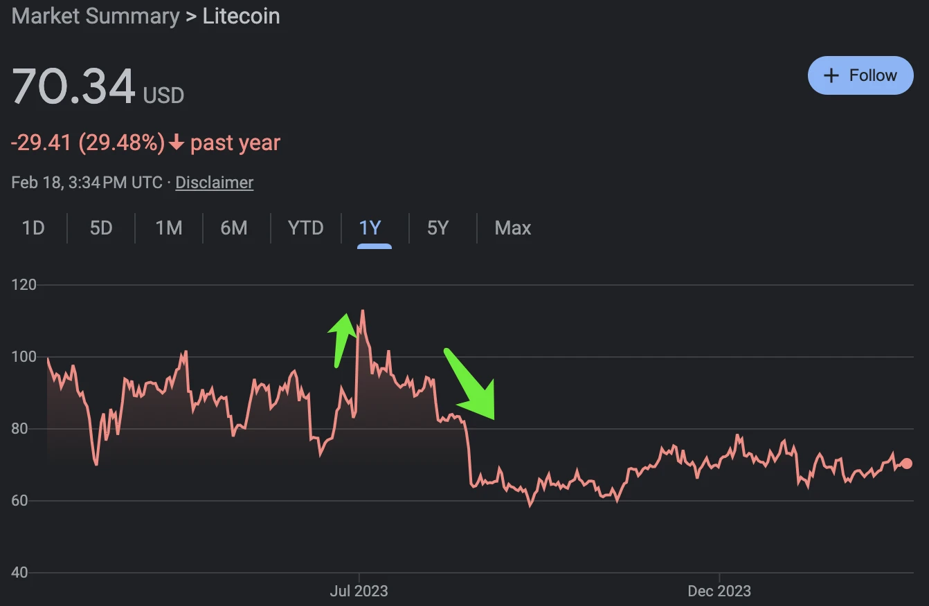 去年 8 月就提前 halving 的 LTC 减半前价格从 80 美元附近一度升至 115 美元,但减半后很快跌至 56 美元,目前徘徊在 70 美元附近面对最近的牛市也还未能反弹至减半前水平。