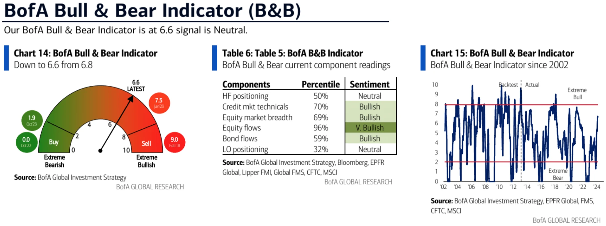 美银牛熊指标从 6.8 降至 6.6 ,位于中性水平: