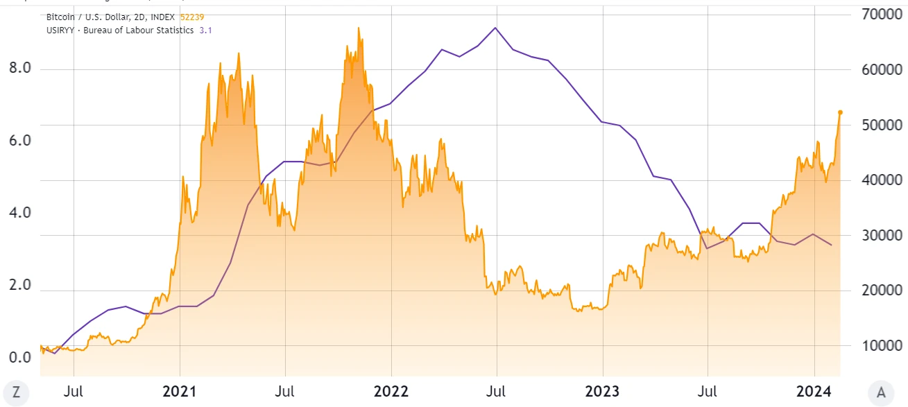由于政策和高杠杆的风险多数在去年已经被清除,包括 Voyager、Genesis、FTX、Ripple、币安等相关破产或监管诉讼案,所以这一轮反弹的基础相对健康。不过问题在于上一轮 2021 年前的牛市是以低利率作为背景的,当时美债收益率低于 0.5% ,叠加财政和货币双重刺激,这导致投资者寻求更高收益率的风险资产,不知是加密货币几乎所有资产和商品服务的价格都在走高,美国 CPI 一度升破 8% ,在此之前美联储启动加息进程主动刺破了价格泡沫,BTC 早于通胀 8 个月见顶