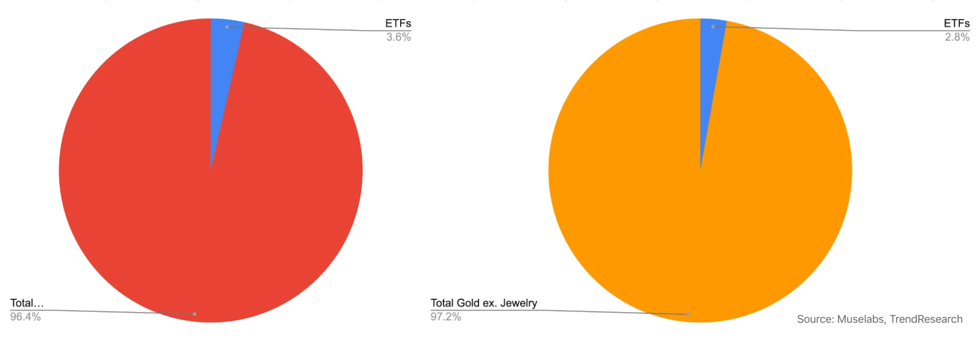 BTC ETF 占比特币市值约 3.7% 。相比之下,黄金 ETF 相当于地表黄金(除首饰)总市值的 2.8% 。就此指标来看 BTC ETF 的进展已经超过了它的最大对手,但这是否是过热的迹象?仅凭这一点还不能得出这样的结论。