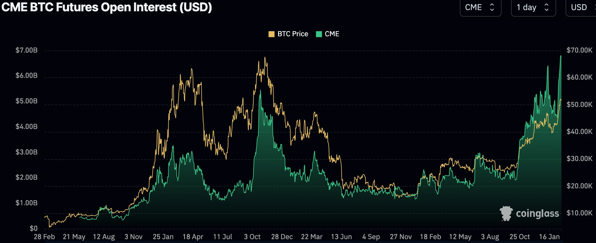 比特币期货未平仓合约(OI)突破 $ 2 2B,为 2021 年 11 月 BTC 价格登顶 6.5 万美元以来最高,当时合约 OI 最高 23 B,新的资金进入市场并支持当前的价格方向,预示这种趋势可能会持续一段时间