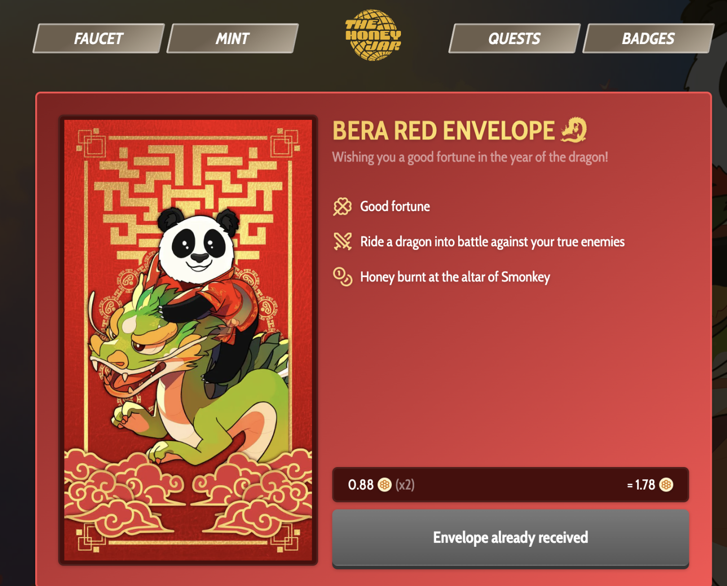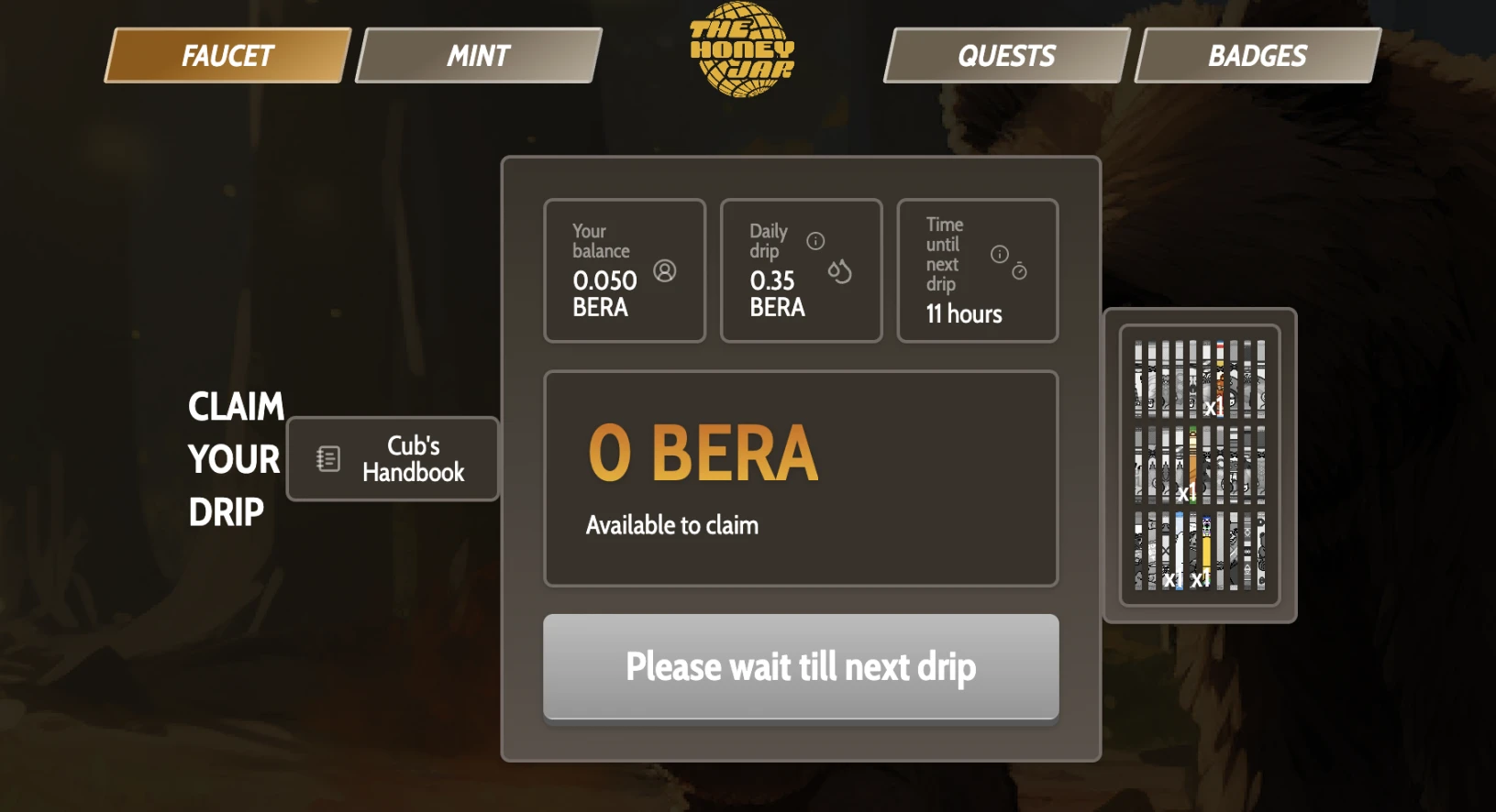 每持有 1 枚其他 Bera 生态系统的 NFT,可领取 0.005 BERA(每天上限 0.01 BERA,最多持有 2 枚)