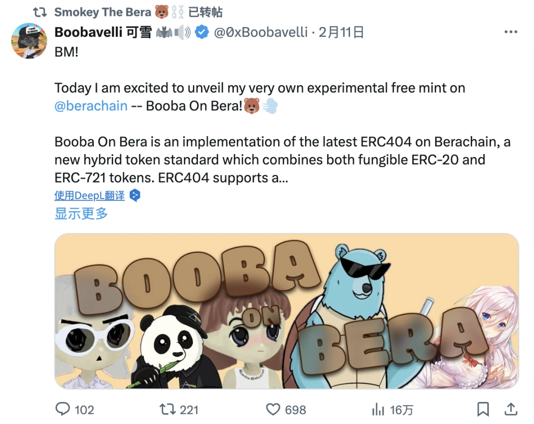 Booba On Bera 是 Berachain 上的 ERC 404 实现,Berachain 创始人 Smokey The Bera 评论并转发,可使用 BERA 测试币 Mint。