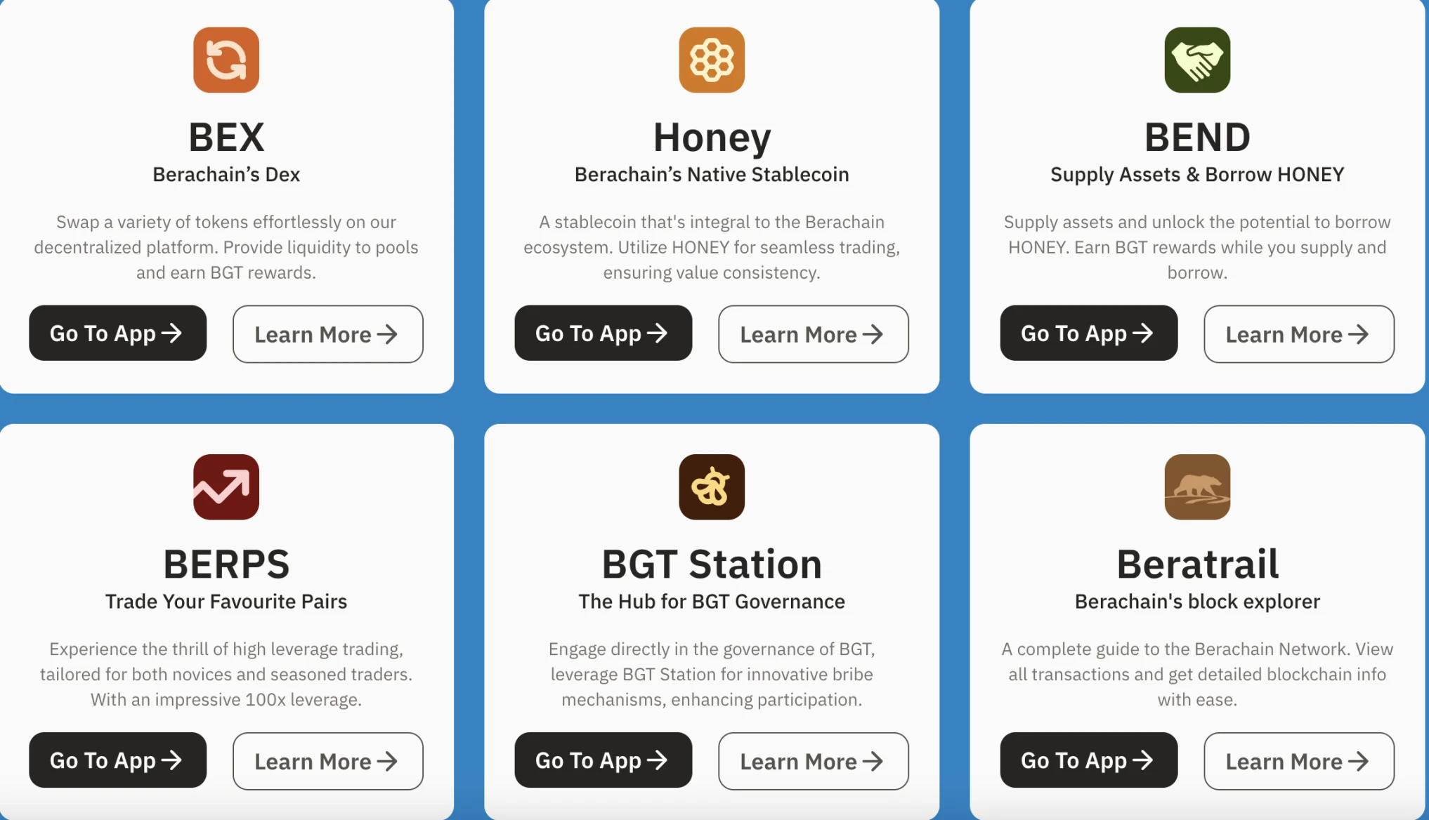 Berachain DApp 包括以下:BEX(交换)、Honey(稳定币铸造 / 赎回)、BEND(借贷)、BERPS(永续交易所)、BGT Station(治理)、Beratrail(浏览器)。