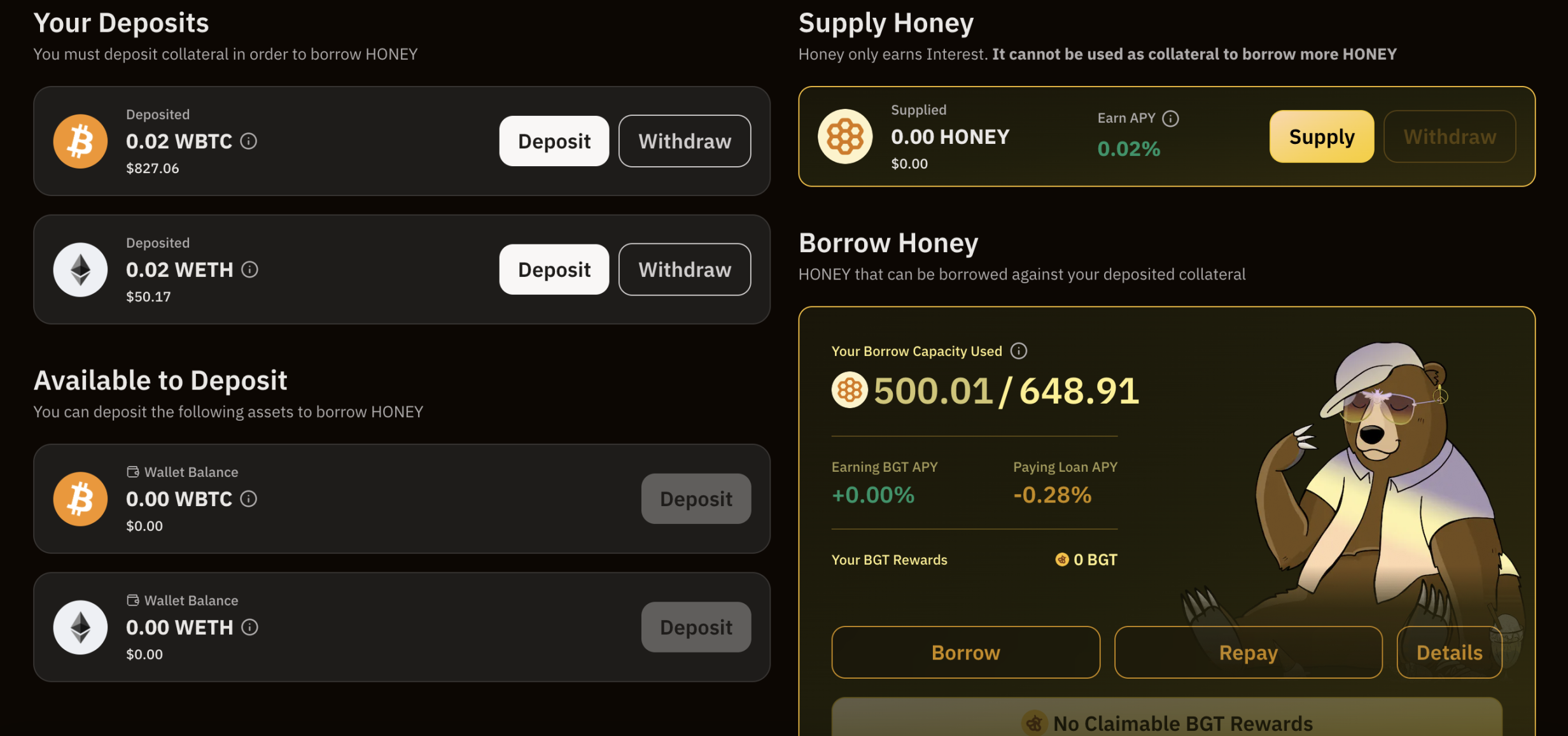 可存入 WBTC、WETH 借出 HONEY,借贷可获得 BGT 奖励