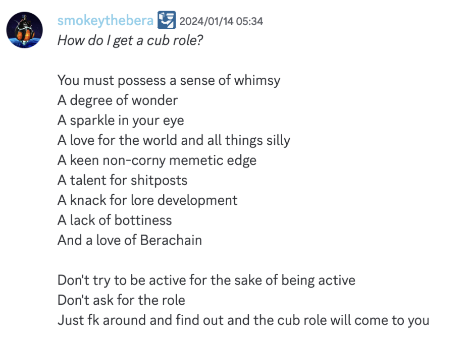 对于 cub 角色获取,Smokey the Bera 也有话说,简言之就是「但行好事,莫问前程」: