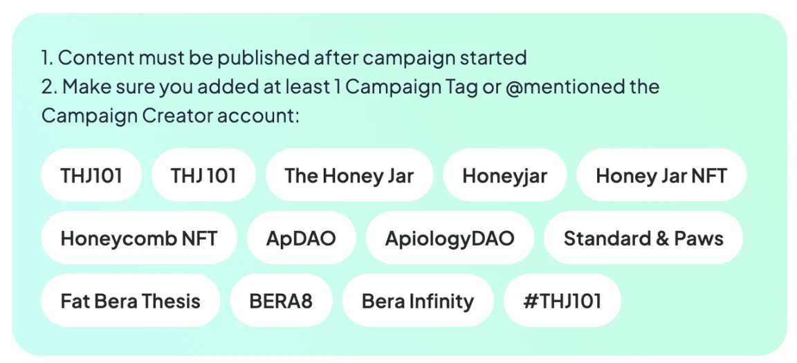 创建任何有关 The Honey Jar(THJ)或其孵化项目的教育推文,可赚取 BERA 测试币。