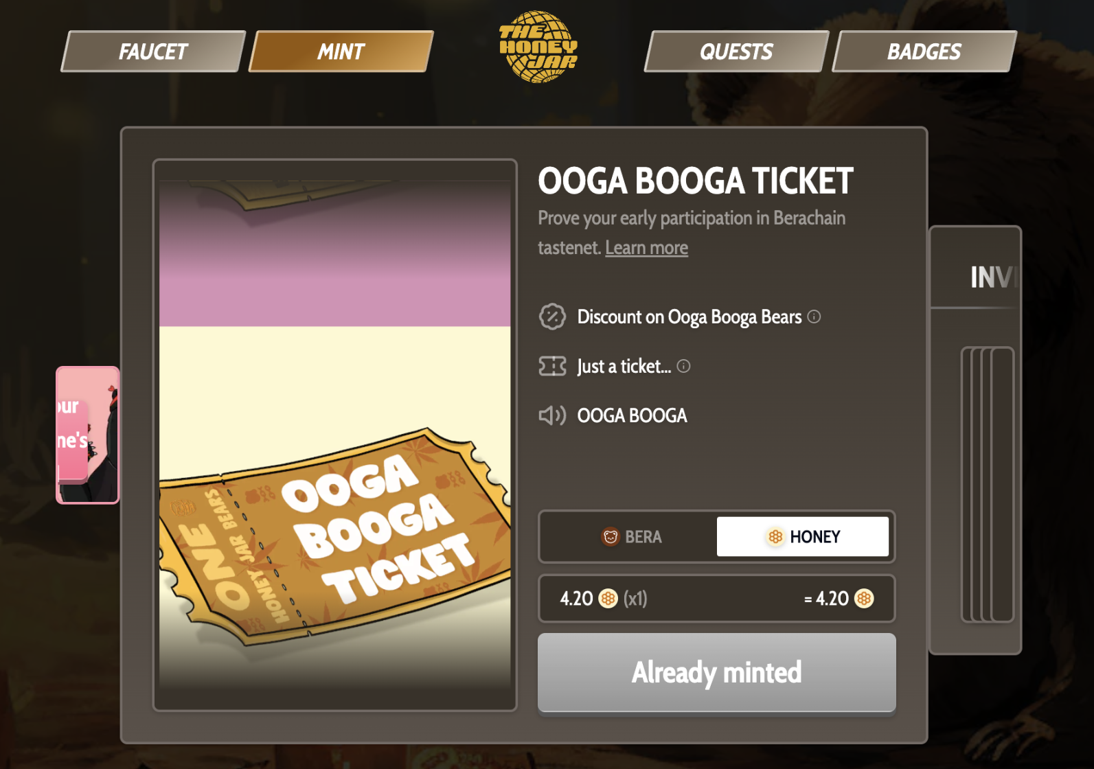 在 Berachain 测试网上铸造至少 1 张 Ooga Booga Ticket 将额外获得抽奖资格