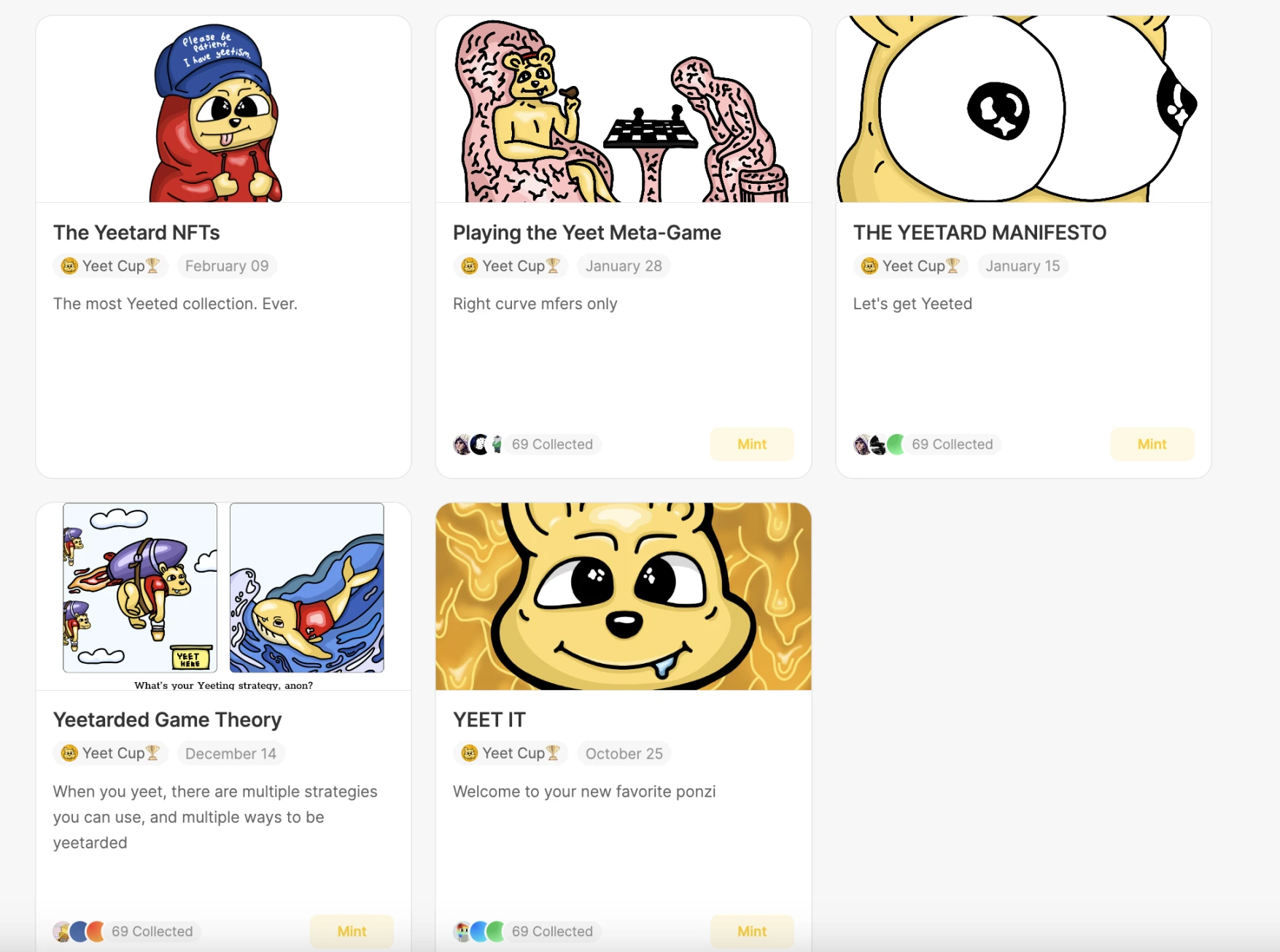 注:Yeet Cup 前 4 篇 Mirror 文章 69 枚 NFT 已铸造完毕,可购买。