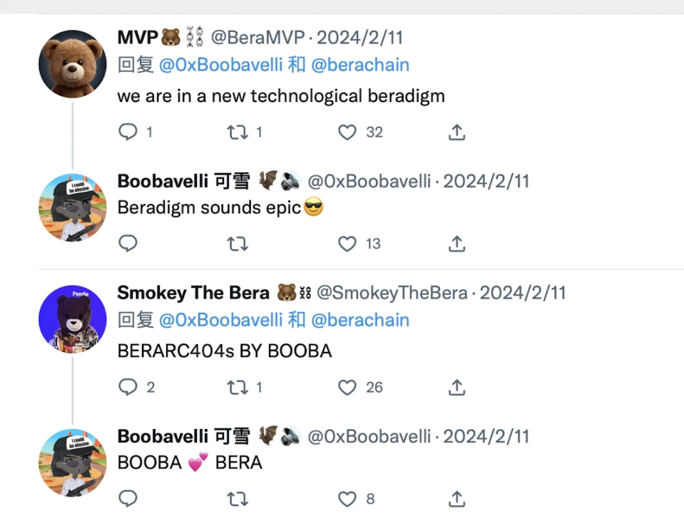 在团队组成方面,Berachain 由 Homme Bera、Dev Bear、Papa Bear 和 Smokey the Bera 等 30 位匿名成员组成,以及今年 1 月 Mysten Labs 前工程主管 Baloo the Bera 加入 Berachain 。