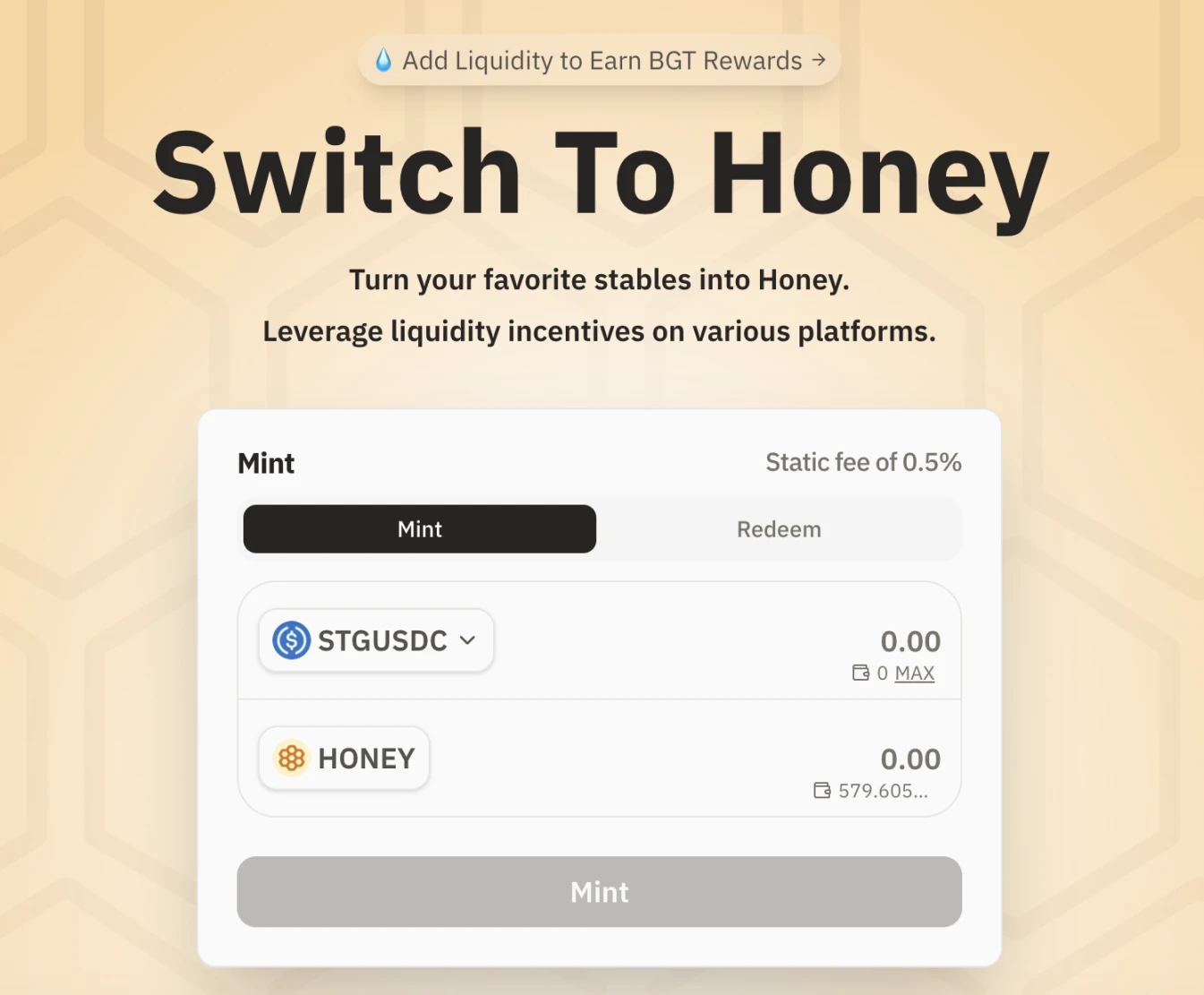 稳定币互换:可将 STGUSDC 铸造为 HONEY,并可将 HONEY 赎回成 STGUSDC。