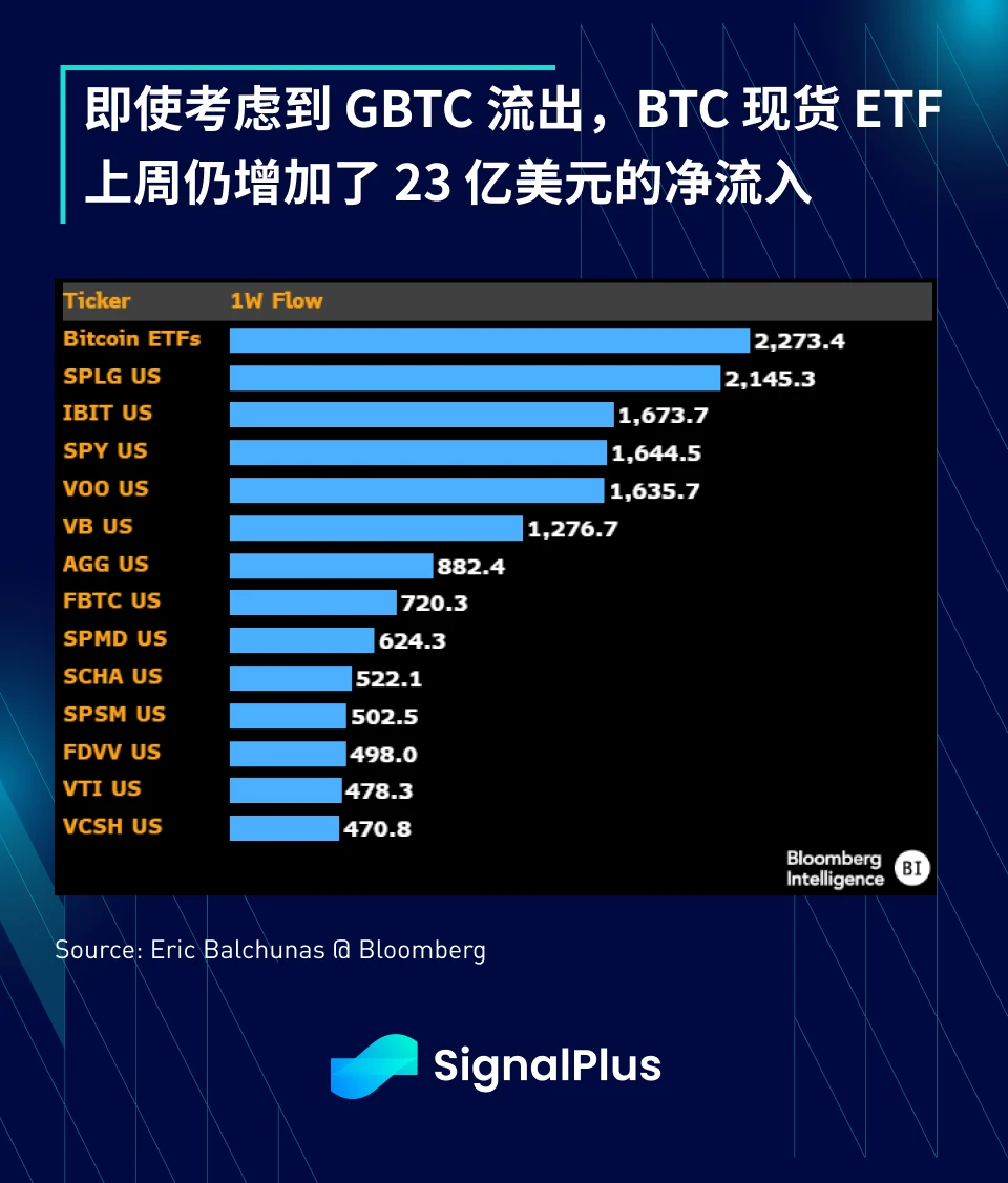 在加密货币方面,现货 ETF 上周净流入 23 亿美元,自推出以来净流入达 50 亿美元,这个数字超过了如 SPY (SPX ETF) 等标竿 ETF 的净流入,这无疑是一个了不起的成就。
