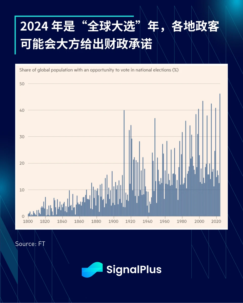 说到财政方面的慷慨,英国《金融时报》的一项利息统计显示, 2024 年在全国选举中投票的全球人口比例将创下历史新高,政治候选人可能会大方承诺各种支出活动,并向各自的国库施加财政支出压力。
