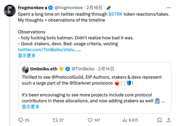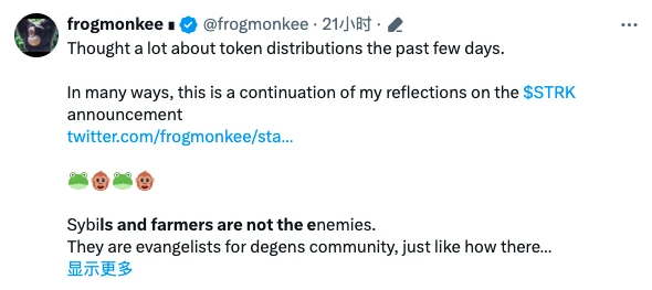 2 月 16 日,Linkedin 资料显示为 zkSync 团队成员的 frogmonkee 于 X 发布了一篇长文,整理了其对社区在 Starknet 后数日的各方面情绪(正面 or 负面)的观察情况。frogmonkee 所摘选的社区评论包括:Starknet 在回馈质押者及开发者方面做得不错,但在标准设计及分配设计上值得商榷; 社区真的很喜欢 Arbitrum 的空投,讨厌 Paraswap 的空投(和 Starknet 一样有最低余额要求);糟糕的反女巫设计可能会导致“婴儿和洗澡水一起被倒掉”; 项目方需要更多公关的技巧,且要与社区保持更清晰的沟通……