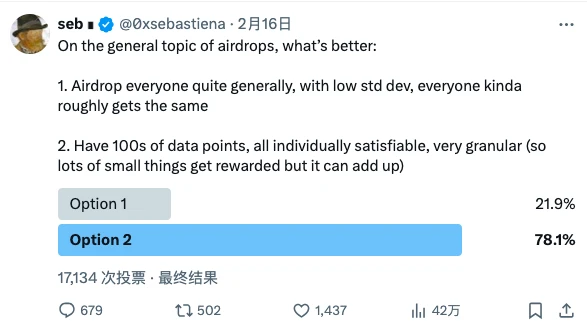随后,Sebastien 又在 X 上发起了一项选择题调查, 询问社区是更喜欢“均分式空投”(标准较低,每个人拿到的空投数额差不多)还是“算细账式空投”(设计上百个细节标准,每个细节标准均会单独检查并累加份额,每个人拿到的空投数额可能会有较大差异)。 最终, 78.1% 的用户选择站队“算细账式空投”。