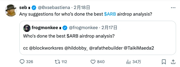 或许是 Arbitrum 的空投设计被提到了太多次, frogmonkee 和 Sebastien 随后又专门发文向社区征询有没有比较好的 Arbitrum 空投分析。