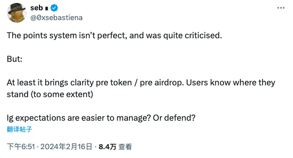 同日,Sebastien 还发文表示, 积分制空投并不完善,招致了不少批评,但它至少可以为用户提供一定的清晰度,方便用户管理预期。