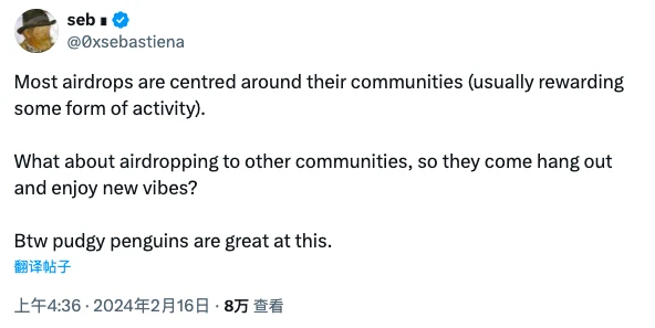 2 月 16 日, Sebastien 在 X 询问“将空投分发给除自家社区以外的其他社区,以吸引更多新鲜血液”会怎么样?