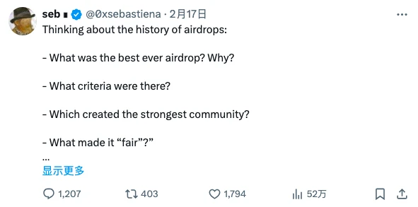 2 月 17 日,Sebastien 再次连发数问, 向社区征询关于“什么才是最好的空投”、“什么才算公平”等问题的意见。
