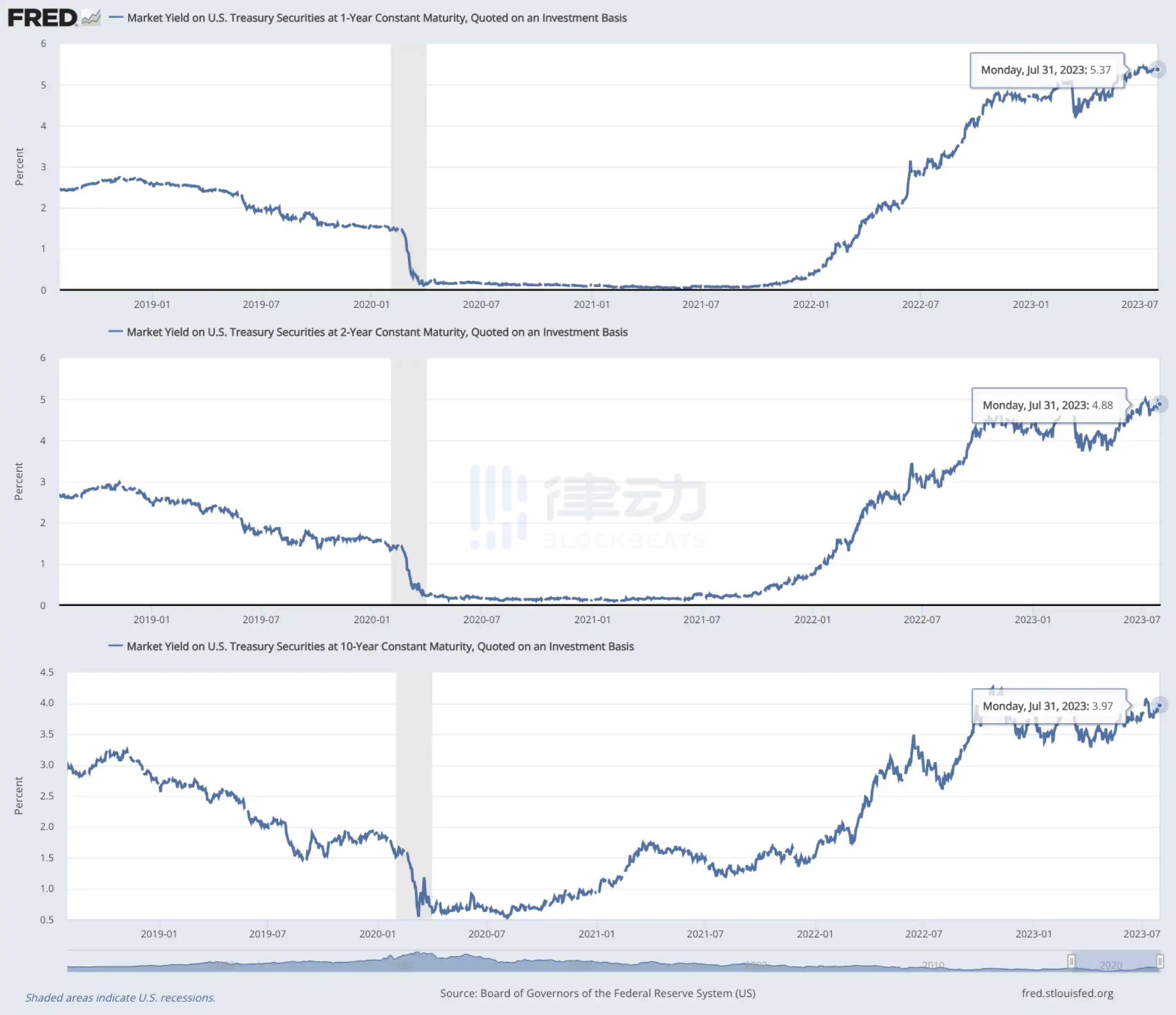 据 FRED 数据,截至去年 8 月,美国一年期、两年期以及十年期国债的收益率分别为 5.37% 、 4.88% 和 3.97% 。抛开收益率曲线不谈,无论是短期还是长期国债,收益率自 2021 年底便开始稳步上升。相较 Curve、Aave 等主流 DeFi 协议,即便是十年期国债目前的收益率也明显高出其平均收益率。