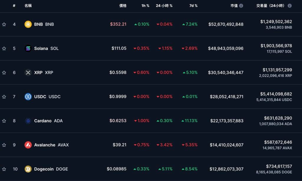 CoinMarkeCap 数据 显示 ,前十大币种近 24 小时则是涨跌不一,其中 DOGE 涨幅最大达 5.11% 逼近 0.09 美元,下跌最多的则是 AVAX 和 SOL,分别有 3.42%、1.15 % 的跌幅。