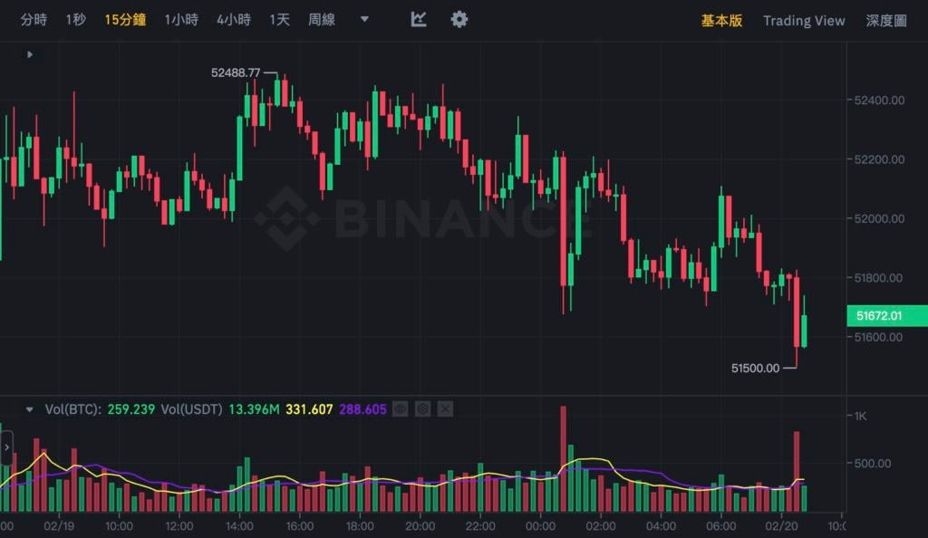 另一方面,比特币(BTC)近 24 小时走势就显德弱势的多,稍早八点半左右最低一度来到 51,500 美元,未能成功站稳 5.2 万美元。截稿前报 51,672 美元、近 24 小时下跌 0.89%。
