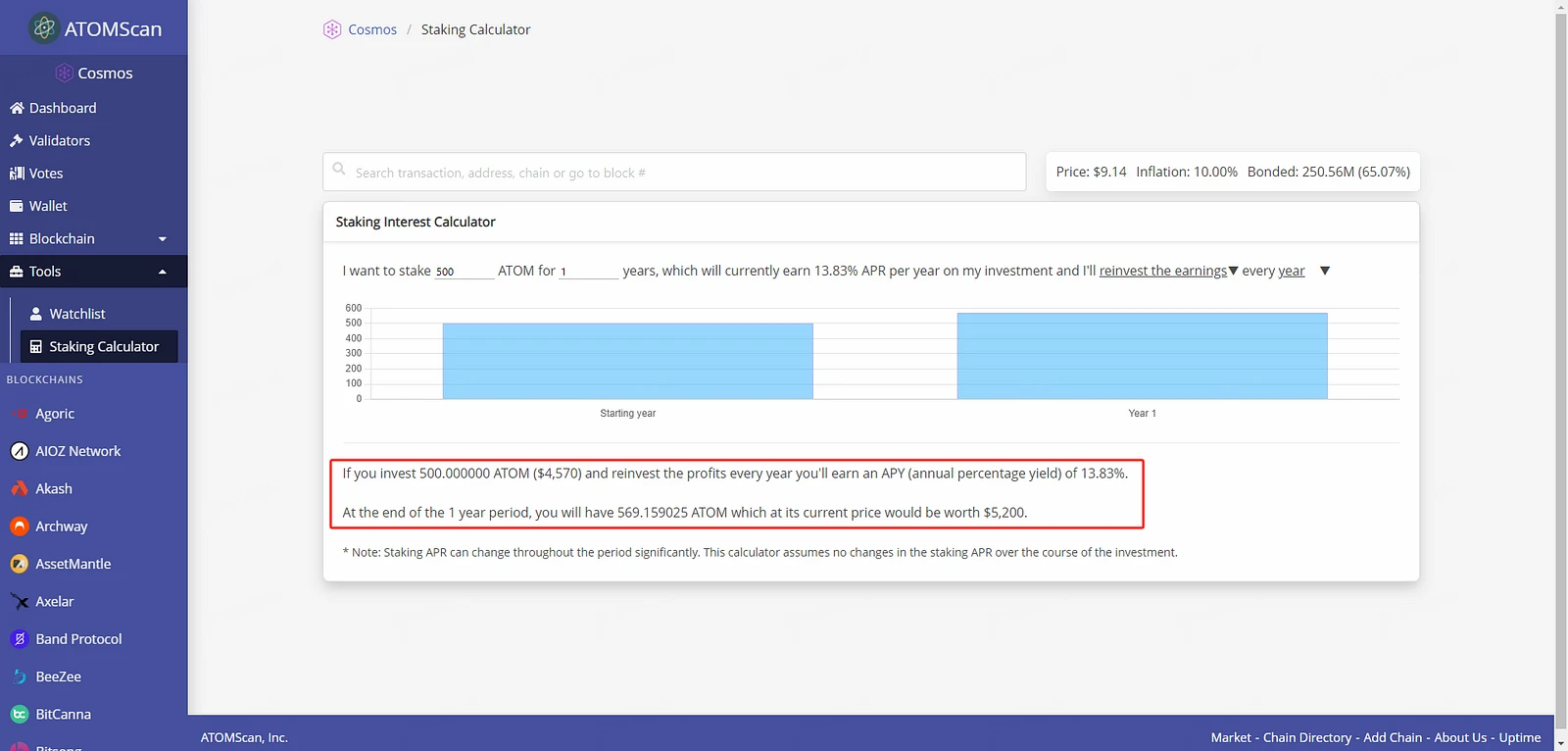 图为质押 500 $ATOM 的 APY,数据来源:https://atomscan.com/tools/staking-calculator