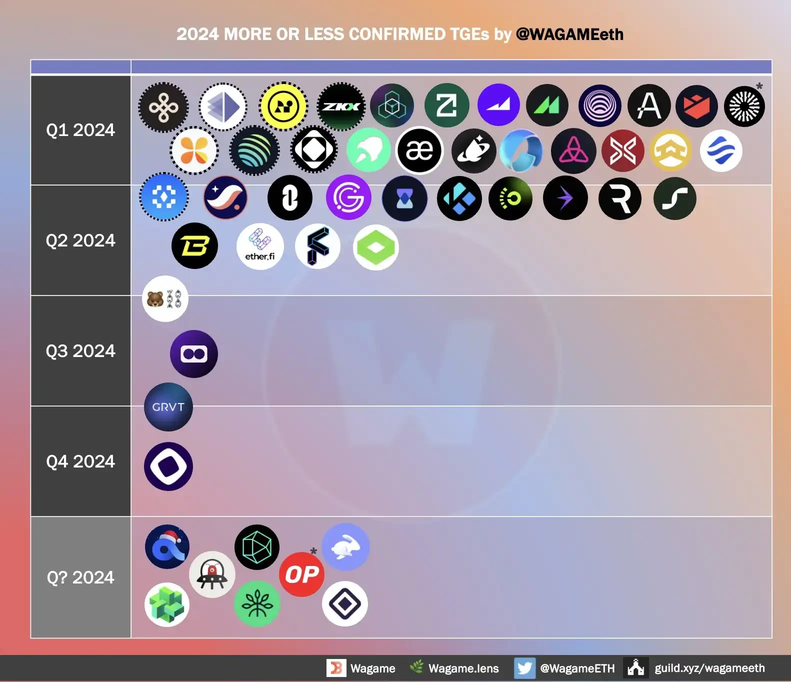 从 @WAGAMEeth 制作的图中可以看出, 2024 年已明确空投的项目十分之多。这还只是已经明确在 2024 年进行空投的项目,随着市场回暖,还会有更多项目将在 2024 年进行空投。