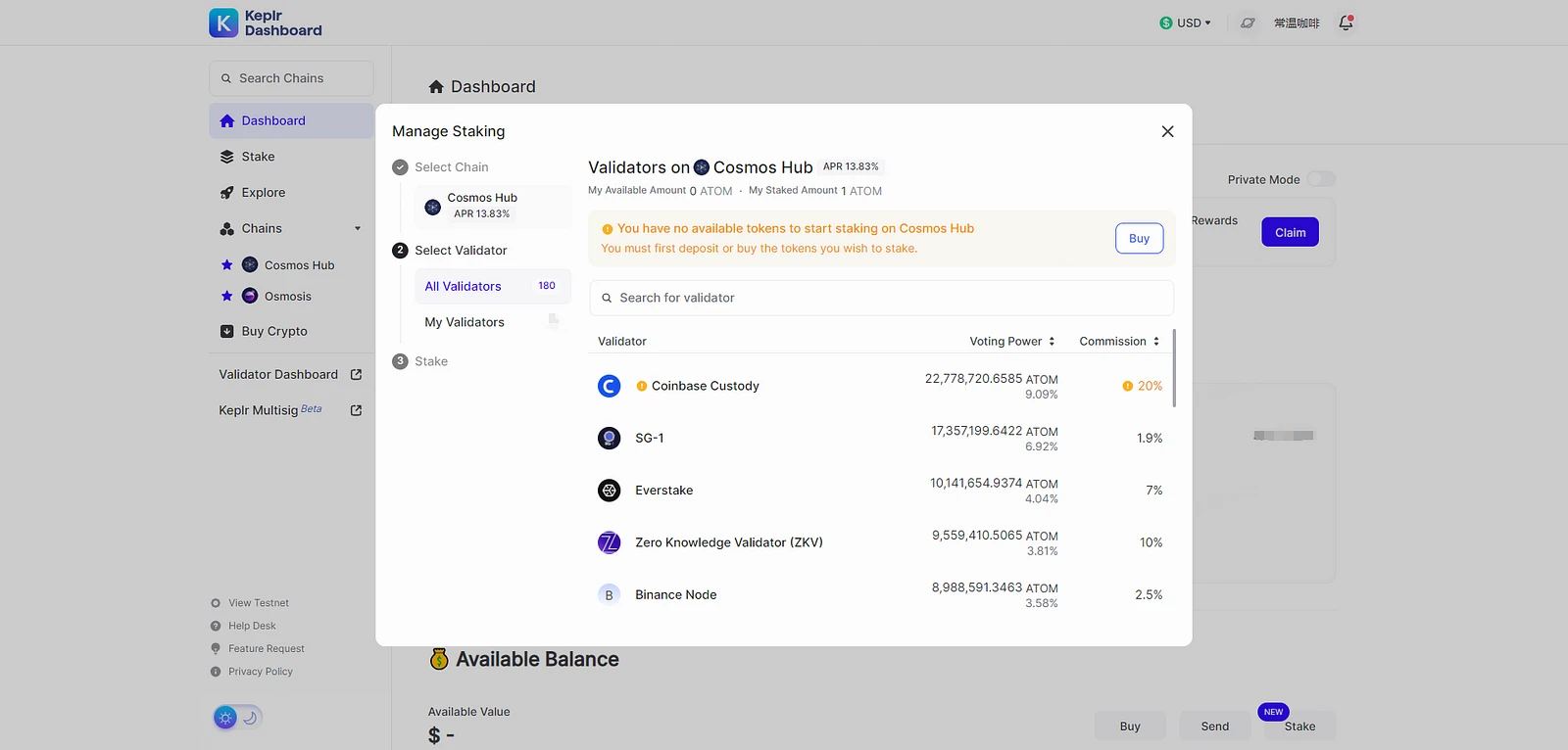 2.然后我们打开 Keplr 的质押看板,选择我们想要质押代币的链。