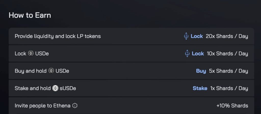 根据 Ethena Labs 官方 说明 ,目前赚取分片奖励的方式有很多,例如提供 LP 流通性、购𧹒或是锁定/质押 USDe…等。