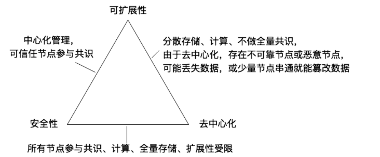 在这些区块链的基础特性中,大都由不可能三角形在制约相互的发展关系。例如,DSS 猜想即去中心化(Decentralization,D)、安全性(Security,S)和可扩展性(Scalability,S)。如下图所示: