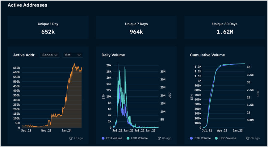 Pixels 之前在 Polygon 上运行, 2023 年移到了 Ronin 网络。根据 Nansen 的数据显示 Ronin 的活跃用户大幅增加,从 11 月份的约 20, 000 人增加到最新更新的 665, 000 人,这其中有一大部分是来源于 Pixels ,Pixels 也成为了继 Axie Infinity 之后 Ronin 上的另一个龙头链游。