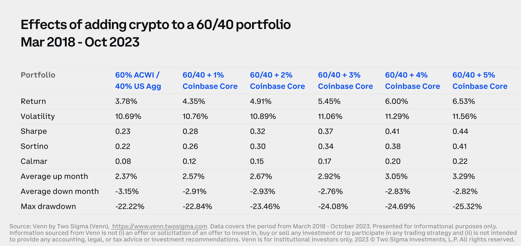 Coinbase 在上月初与 Glassnode 联合发表 2024 年第一季加密市场指南 时,也研究了将加密货币配置到传统投资组合中的作用,结论令人惊喜,显示在绝对报酬率以及风险调整后的报酬上,向投资组合中添加加密货币都能提升收益。