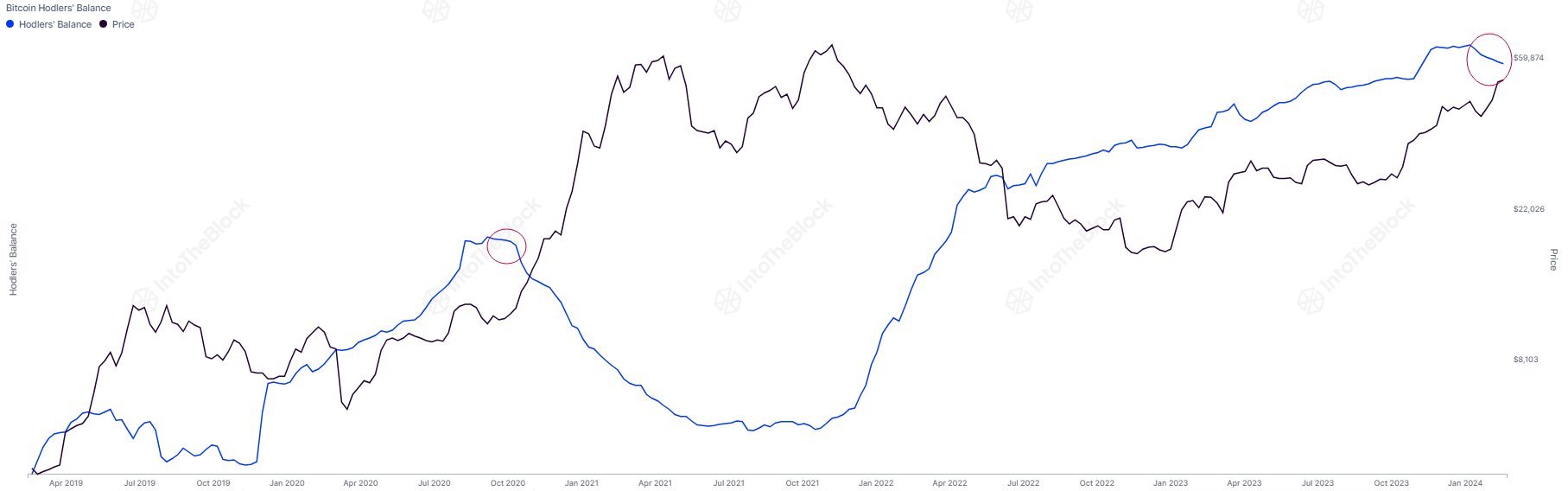 侭管出现抛售,但 IntoTheBlock 指出,这是牛市期间「典型的长期持有者活动」,且与先前牛市相比,抛售速度有明显的差距,在上次牛市期间,长期持有者的持有量减少了约 15%,但当前的持有量减幅仅约 1.5% 。