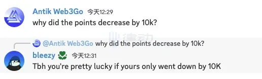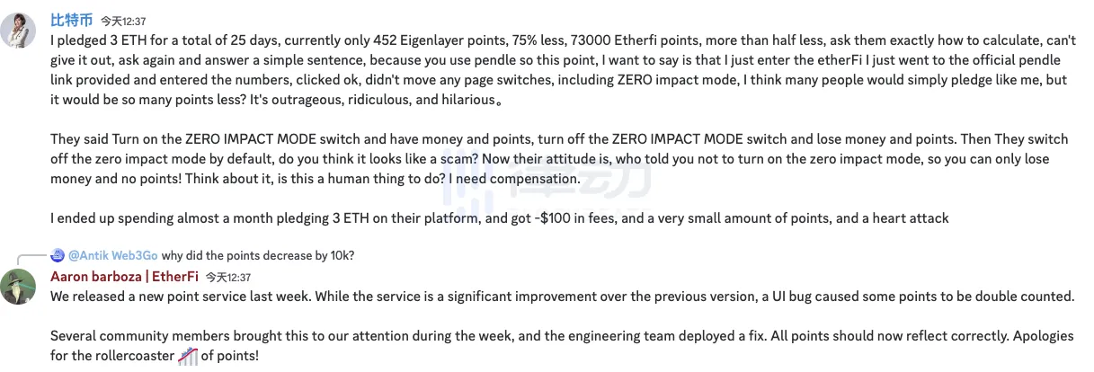 缩水一半,少算的积分去哪了?这样的发现激起了社区的讨论,不见回应,社区成员将此事上升到团队人品和做事方式上。ether.fi 的 Discord 社区里,有人对发现自己积分减少的成员回复称,「如果你只少了 10 k 积分,那你还是幸运的」。在推特上,也有 ether.fi 的早期关注者表示「一点也不惊讶」。
