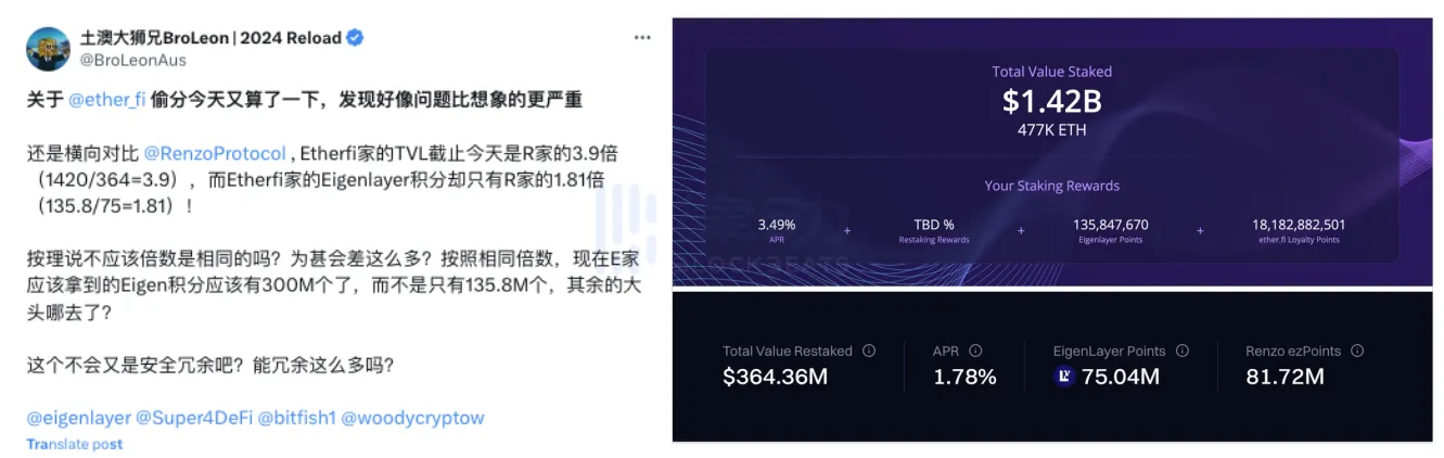 2 月 19 日,有社区成员 反应 ,质押数和质押时间相同情况下,与 Renzo Protocol 相比,ether.fi 较 Renzo Protocol 少了约 10% 的 eigenlayer 积分。但当时有人指出,这可能是因为质押机制不同所产生的结果。