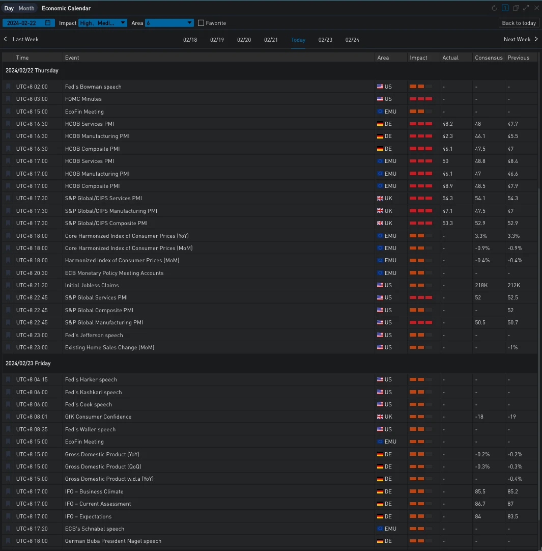 昨日(21 FEB)英伟达Q4财报在美股盘后新鲜出炉,财报显示,受益于 AI 芯片需求的大量增加,该公司第四季度的营收利润均同比暴涨超出了市场和分析师的预期,黄仁勋称生成式人工智能已经触及引爆点,英伟达股价在盘后上涨逾 10% 。另一方面,美联储新公布的纪要再度削弱了市场对提前降息的预期,美债收益率逐步走高,两年期/十年期现报 4.669% /4.306% ,三大股指涨跌互现,道指和标普收涨 0.13% ,纳指下跌-0.32% 。