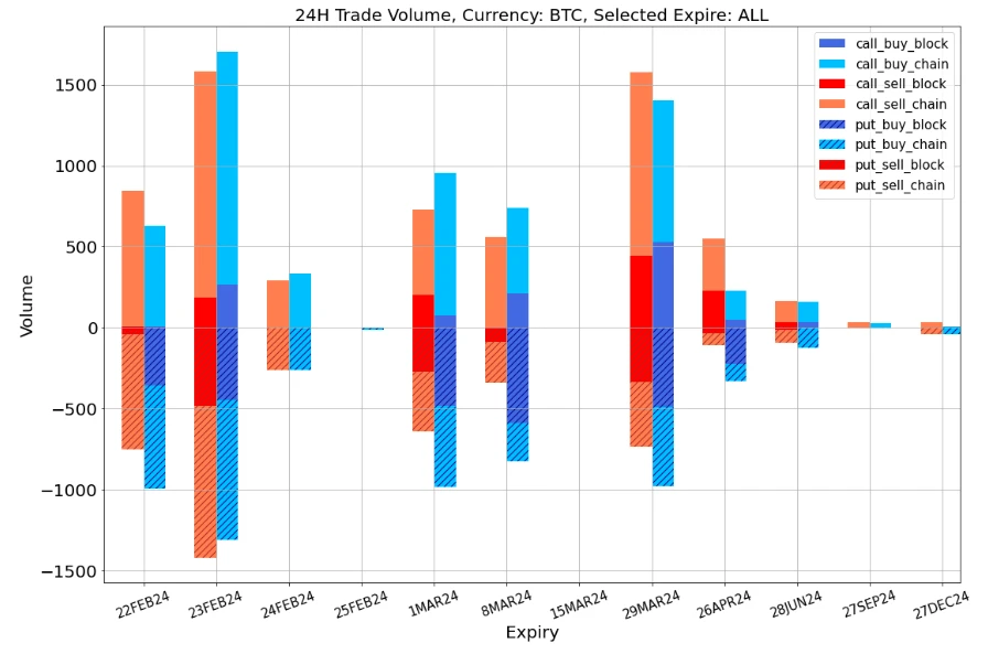 另一方面,明天即将迎来大规模的月末交割,过去 24 小时市场已经提前在 23 FEB 24 上做了平仓操作, 提前释放了保证金 ,例如 BTC 54000-C/58000-C 的卖出止盈单,以及 ETH 2400-C 六千张的止损单。