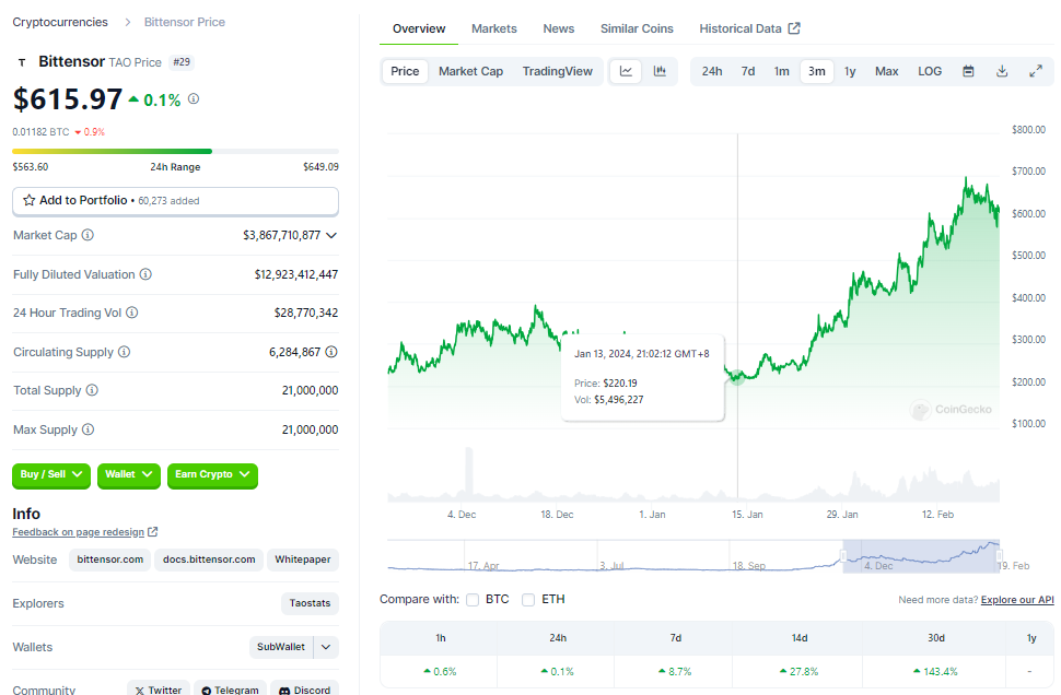 Bittensor 项目代币 TAO 是本轮 AI 加密行情中最早启动的项目之一,TAO 代币价格从 1 月 15 日的 200 美元左右一路冲至 2 月 16 日的 700 美元,涨幅高达 3 倍多。