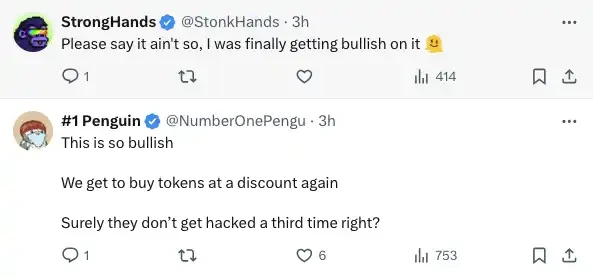 Ronin 又被盗了?社区的反应更多是不敢相信,「我刚刚开始看好他」,还有人调侃「那是不是可以趁低价买入,他们应该不会遭受第三次攻击了」。