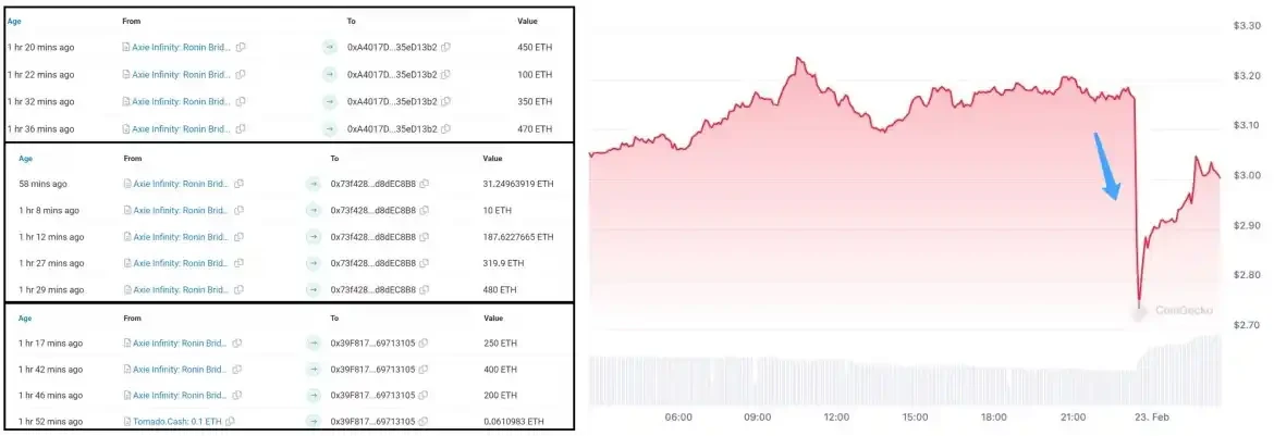 在团队宣布被盗后,RON 在一天内跌去 20% ,并在之后的一个月里持续下跌,缩水 84% 。2022 年的绝大部分时间,RON 的价格都在 1 美元以下。有这样的惨痛经历,在发现 Ronin 上的资产有可疑动向后,社区的第一反应肯定是「Ronin 又被盗了?」