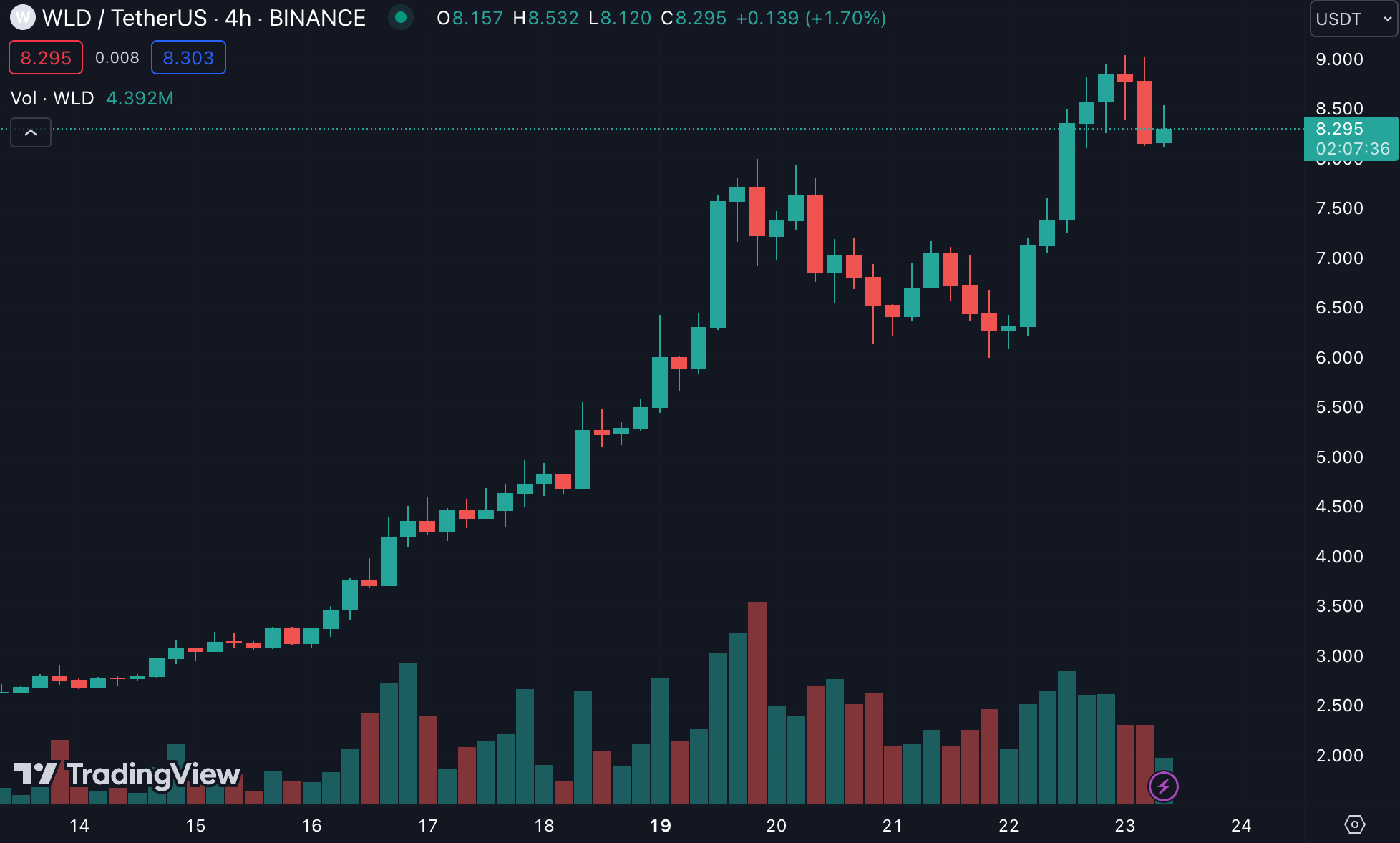 Worldcoin 原生代币 WLD ,今(23)清晨再度刷新历史新高,一度站上 9.037 美元至截稿前,WLD 暂报 8.295 美元,近 24 小时大涨 16.1%。过去一个月累积涨幅已超过 265%、年涨幅更是突破 5,372%。